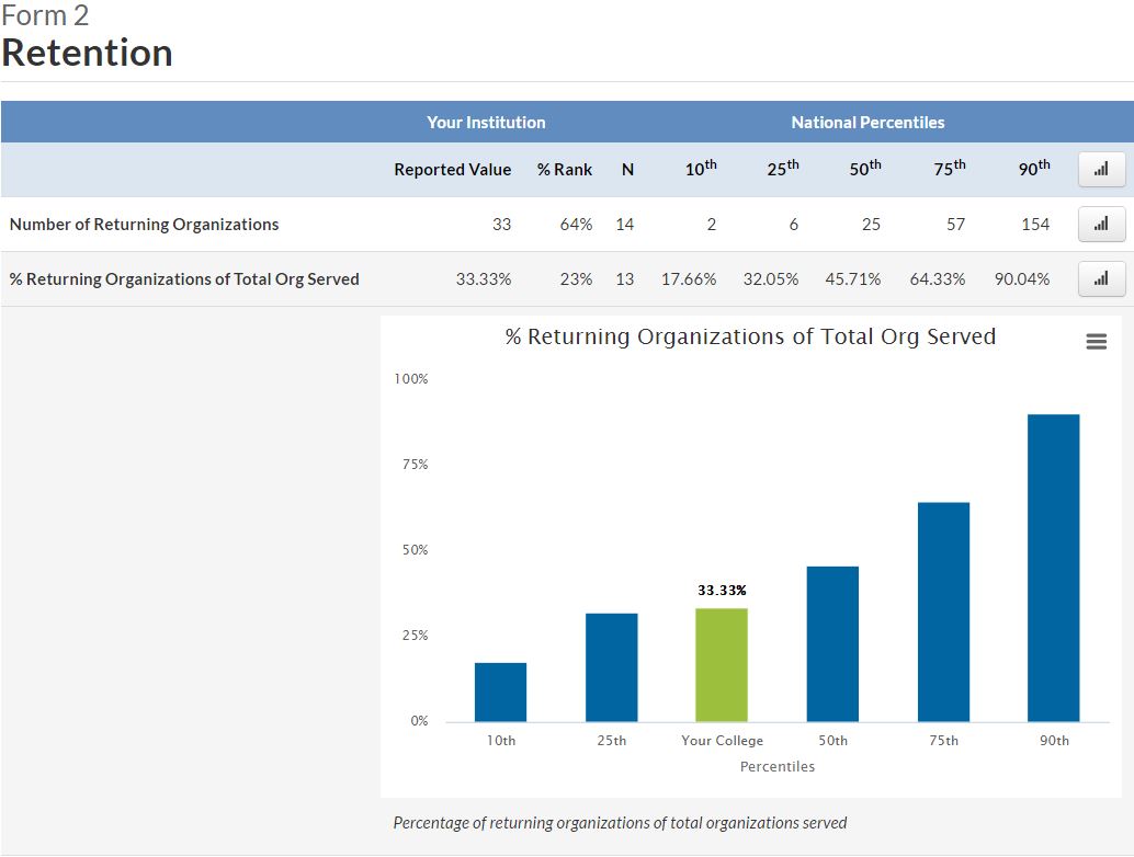 Reports include your college's benchmark values and percentile ranks, as well as the 10th, 25th, 50th, 75th, and 90th percentiles of national data for each benchmark.