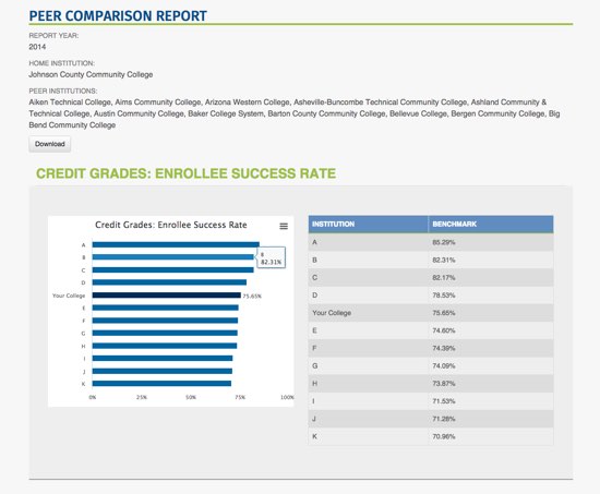Compare benchmarks to other community colleges that submitted data. Your institution is identified by name while peer institutions are identified anonymously.